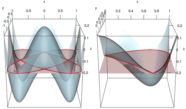 FUN <- function(x,y) x^4 + y^4 - x^2 - y^2 + 1/4 x <- y <- seq(-1, 1, length=50) # seq(0, 1) pentru a doua figură z <- outer(x, y, FUN) id <- rgl::persp3d(x, y, z, color="lightblue", alpha = 0.5) rgl::planes3d(0, 0, 1/sqrt(2), color="red", alpha = 0.3) rgl::contourLines3d(id, nlevels=1, color="red", alpha=1, add=TRUE, lwd=3)