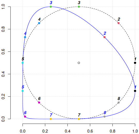 S <- seq(0, 2*pi, length=10000) ix <- function(s) 1/2 + 1/2*cos(s) iy <- function(s) 1/2 + 1/2*sin(s) X <- ix(S) # vectorul absciselor punctelor lui (C) Y <- iy(S) # vectorul ordonatelor punctelor lui (C) plot(0, type="n", xlim=c(0, 1), ylim=c(0, 1), bty="n", asp=1) points(X, Y, type="l", lty=2) # cercul (C) (negru, punctat) points(X^2, Y^2, type="l", col="blue", lwd=1.2) # curba (K) (albastru) # marchează puncte (x,y) pe (C) și asociatele lor pe (K), (x^2,y^2) P <- seq(0, 2*pi, by = pi/4) points(ix(P), iy(P), pch=19, col = 1:8) points(ix(P)^2, iy(P)^2, pch=19, col = 1:8)
