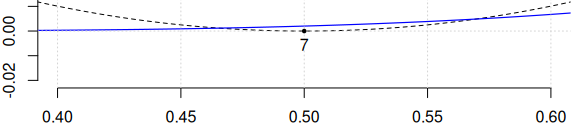 Deducem că în jurul punctului negru '7', $(\mathcal{C\,})$ și $(\mathcal{K\,})$ au două puncte comune, la abscisele $\approx 0.46$ și $\approx 0.56$. Devine clar (măcar vizual) că $(\mathcal{C\,})$ și $(\mathcal{K\,})$ se intersectează în șase puncte, simetrice câte două, față de prima bisectoare.