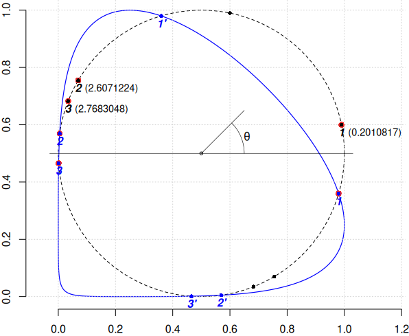 Constituim întâi o funcție, comm_angle(), care primind ca argument un unghi polar $\theta$, determină coordonatele $(x,y)$ ale punctului $P(\theta)$ al cercului $(\mathcal{C\,})$ și returnează diferența $x^4+y^4 - 2(x^2+y^2) + x+y$ dintre $(\mathcal{K\,})$ (în punctul $(x^2,y^2)$) și $(\mathcal{C\,})$ (în punctul $(x,y)$); când această diferență este zero, punctul $(x^2,y^2)$ aparține și cercului și curbei $(\mathcal{K\,})$ (iar uniroot() va returna (aproximativ) unghiul $\theta$ corespunzător acestei situații).