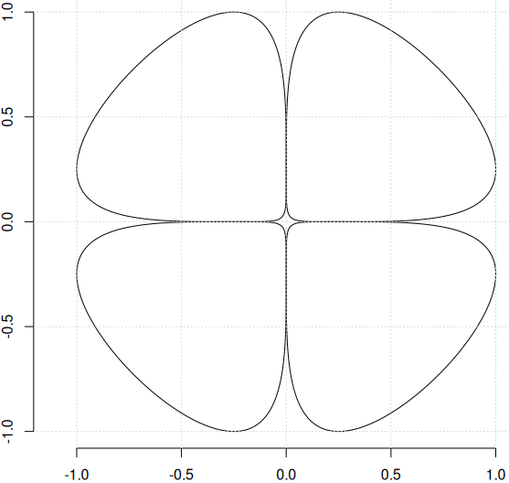 În final să zicem, se cuvine să remarcăm o dilemă… Ecuația $(\mathcal{K})$ echivalează cu $(y^2-\frac{1}{2})^2=\frac{1}{4}-(x^2-\frac{1}{2})^2$, iar de aici avem $y=\pm\sqrt{\frac{1}{2}\pm\sqrt{x^2-x^4\,}\,}$ și plotând aceste puncte $(x,y)$ regăsim cele "două ovale" produse deja în [1]. Pentru aceeași ecuație, am avea deci o reprezentare ("două ovale") dacă procedăm "algebric" și o altă reprezentare ("patru loburi"), folosind ca mai sus "coordonatele polare"…