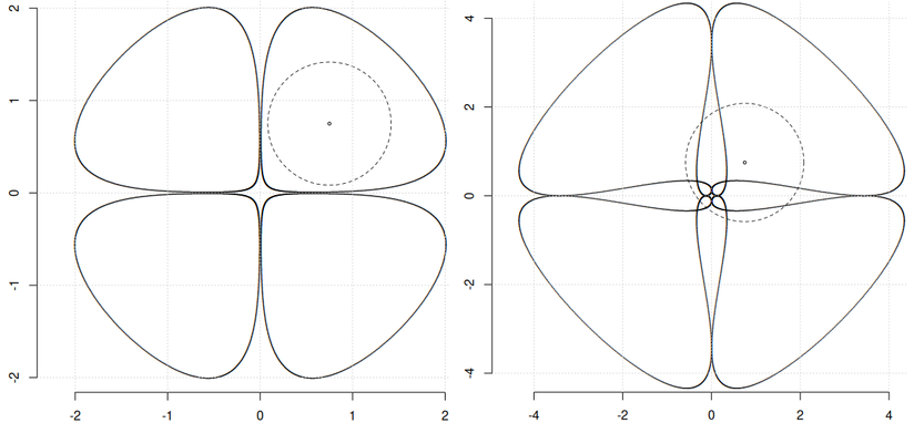 Cum stau lucrurile dacă plecăm de la un alt cerc? De exemplu, pentru pătratele coordonatelor punctelor cercului de centru $(3/4,\,3/4)$ și rază subunitară $\sqrt{2/3}$, avem o curbă similară cu $\mathcal{K}$ de mai sus (iar cele patru loburi apar mai clar și vedem că sunt tangente câte două, în câte un anumit punct); dar forma "lobului" se schimbă (aducând cu o acoladă caligrafică ascuțită, cu buclă la mijloc, completată cu un arc în partea opusă), dacă luăm o rază supraunitară, $\sqrt{4/3}$ (a observa că scările celor două figuri diferă…):