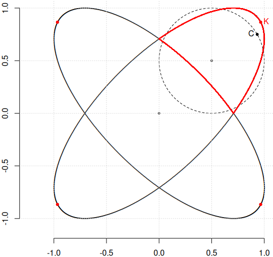 Despre curba $\mathcal{K}$ rezultată, în [1]-I (unde am produs-o în manieră "algebrică") ziceam cam așa: "Dacă ne-am lua după ce vedem, am zice că este compusă din două ovale (elipse?, cu axele respectiv perpendiculare); dar polinomul corespunzător este ireductibil, ceea ce am constatat folosind wolframalpha.com".