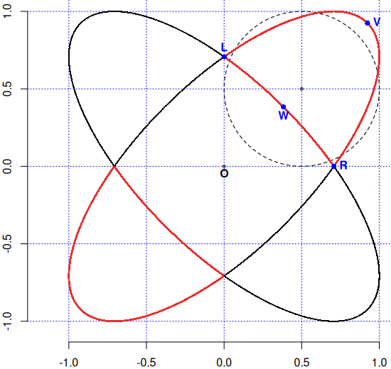 Urmărind "punct cu punct" cum se trasează curba $\mathcal{K}$, ne putem da seama că totuși, cele două "elipse" nu sunt trasate cum am crede dacă am fi trasat "deodată" graficul — întâi prima elipsă (complet) și apoi la fel, pe a doua… De fapt, se trasează întâi porțiunea din primul cadran, însemnând arcul LVR al primei elipse plus arcul LWR al celei de-a doua elipse (apoi se repetă mutatis mutandis pe celelalte cadrane, în care — dar n-am mai trasat — avem câte o "copie" simetrică cercului $\mathcal{C}$ din primul cadran).