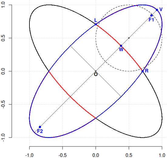 V <- sqrt(xC(pi/4)) + 1i*sqrt(yC(pi/4)) L <- sqrt(xC(pi)) + 1i*sqrt(yC(pi)) R <- sqrt(xC(3*pi/2)) + 1i*sqrt(yC(3*pi/2)) W <- sqrt(xC(5*pi/4)) + 1i*sqrt(yC(5*pi/4)) points(c(V, L, R, W), col="blue", pch=16) text(c(V, L, R, W), labels = c("V", "L", "R", "W"), pos = c(4, 3, 4, 1), offset=0.4, col="blue", font=2) a <- abs(V) # semiaxa mare b <- abs(W) # semiaxa mică