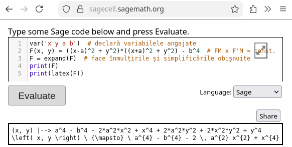 $$F(x, y) = (x^2 + y^2)^2 − 2a^2(x^2 − y^2) − (b^4 − a^4) \tag{1}$$(neimportant: avem $a$ și $b$, în loc de $c$ și $a$; $b^4$ pare mai lizibil versus $c^4$ și $a^4$)