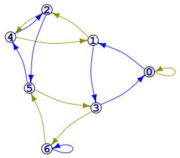 În matricea redată mai sus, am boldat valorile '1' corespunzătoare arcelor blue — încât vedem direct din matrice, secvența binară a lui $Q$: '1001' (de valoare 9). Numărul reprezentat în starea $5$ din care pleacă ciclul $Q$ este de forma $7q+5$; alipind formei binare a acestuia, secvența '1001', rezultatul va reprezenta numărul $2(7q+5)+9$, care se vede imediat că are tot restul $5$ (față de $7$).